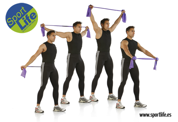 Con un tensor, realiza circunducciones hacia delante y atrás, un ejercicio que consigue mejorar la movilidad de la articulación del hombro y sobre todo estirar pectorales.